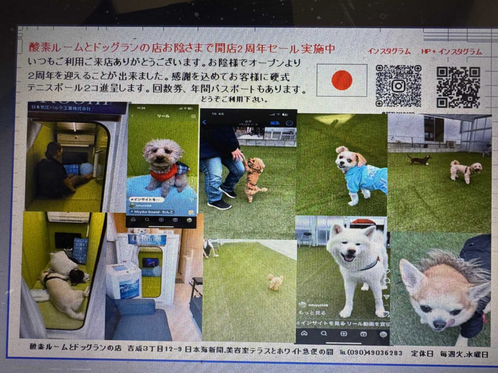 音楽を聴く事,食べる事,健康,動物が好きなおやじが.雨の日でも動物と遊べる所をと思って酸素ルームと一緒に作りました.トラブル防止の為,同一家族,グループでの受付としています.おやつ,飲料,おもちゃの持ち込み可,大型犬の利用可です.自宅にいるつもりでご利用下さい。まずお電話又はショートメールで連絡下さい